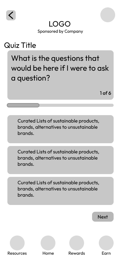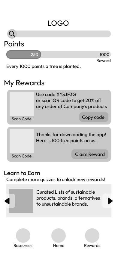 Another challenge was in designing the rewards system. My early wireframes included ideas such as planting a tree for every thousand points, or offering gift cards. However, I quickly ran into questions of feasibility and trust. Rewards have to come from somewhere, but if they came directly from the companies being evaluated, it could compromise the app’s credibility. In the feedback section some of the interviewees mentioned they be slow to trust this app, assuming that it was a greenwashing tool.