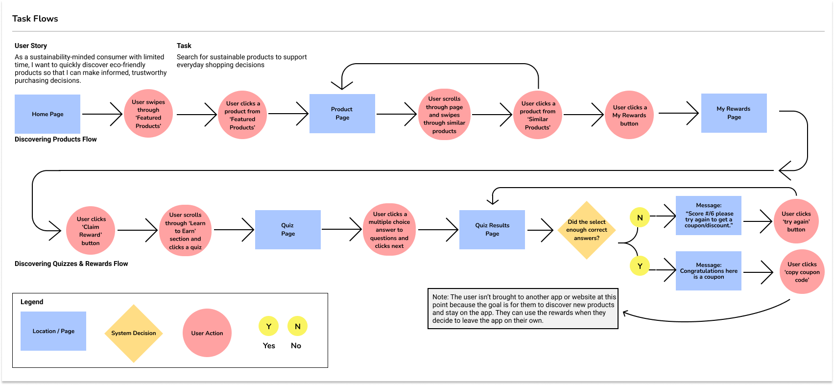 In the end, I left the rewards concept open-ended, but this process pushed me to think deeply about business models, incentives, and stakeholder trust, not just user experience. If this were to be developed, I would explore rewards in the form of sponsored coupons or discounts provided by sustainable companies, while keeping the evaluation process completely independent.